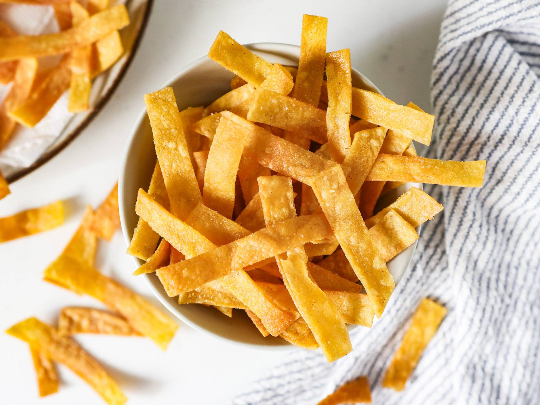 βCrispy Tortilla StripsβA fun topping to add on top of your chili! These crispy homemade tortilla strips are made with just 3 ingredients in 10 minutes.